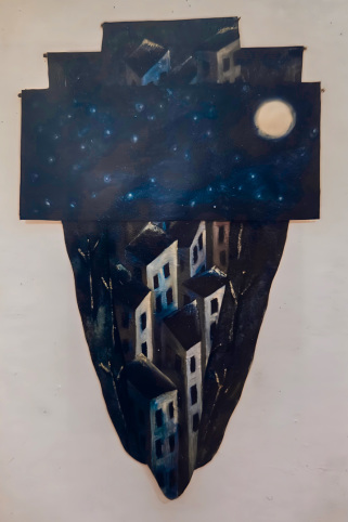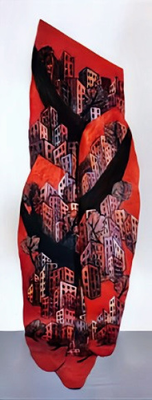 These paintings were constructed after looking at buildings around my Brooklyn neighborhood. In these paintings, I was not interested in displaying buildings but created stylized images of buildings, trees, and pavements. Like other paintings, these works are large, shaped oils on canvas that hang from the wall down onto the floor.